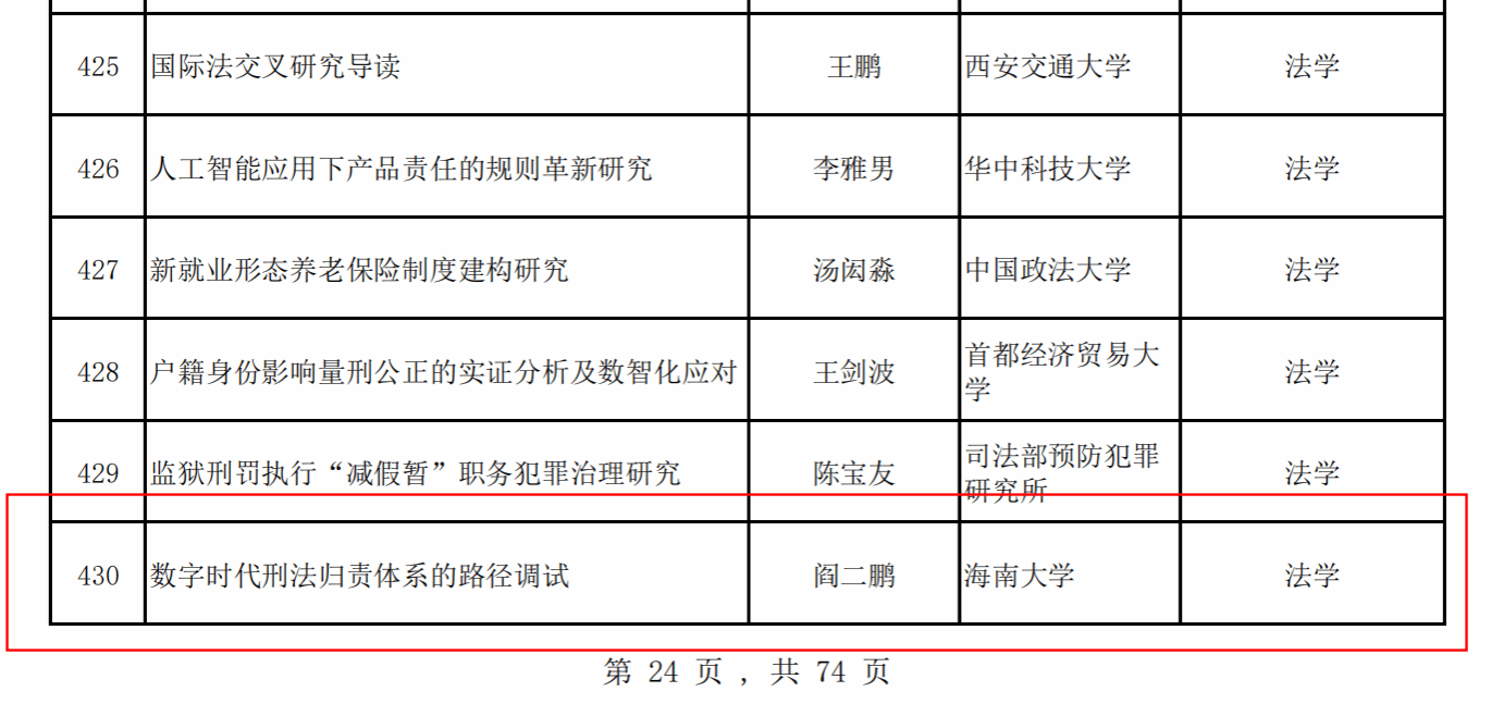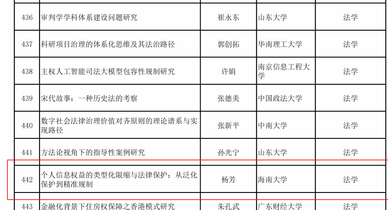 近日,全国哲学社会科学工作办公室公布了2025年国家社会科学基金后期资助暨优秀博士学位论文出版、优秀学术著作再版项目立项名单。我院阎二鹏教授的《数字时代刑法归责体系的路径调试》、杨芳教授的《个人信息权益的类型化限缩与法律保护:从泛化保护到精准规制》获得2025年国家社科基金后期资助项目立项。